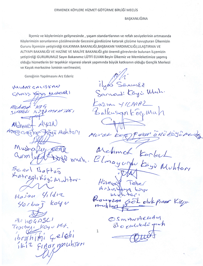 ‘’Ermenek Köylere Hizmet Götürme Birliği Meclis Başkanlığı’na. İlçemiz ve köylerimizin gelişmesinde, yaşam standartlarının ve refah seviyelerinin artmasında köylerimizin sorunlarının çözülmesinde gecesini gündüzüne katarak çözüme kavuşturan, ülkemizin gururu ilçemizin yetiştirdiği Kalkınma Bakanlığı, Başbakan Yardımcılığı, Ulaştırma ve Altyapı Bakanlığı, Hazine ve Maliye Bakanlığı gibi önemli görevIerde bulunan ilçemizin yetiştirdiği, gururumuz Sayın Bakanımız Lütfi Elvan Bey’in ülkemiz ve memleketimize yapmış olduğu hizmetlerin bir teşekkür nişanesi olarak yapımında büyük katkısı olduğu Gençlik Merkezi ve Kayak Merkezi’ne isminin verilmesini; Gereğinin yapılmasını arz ederiz.’’