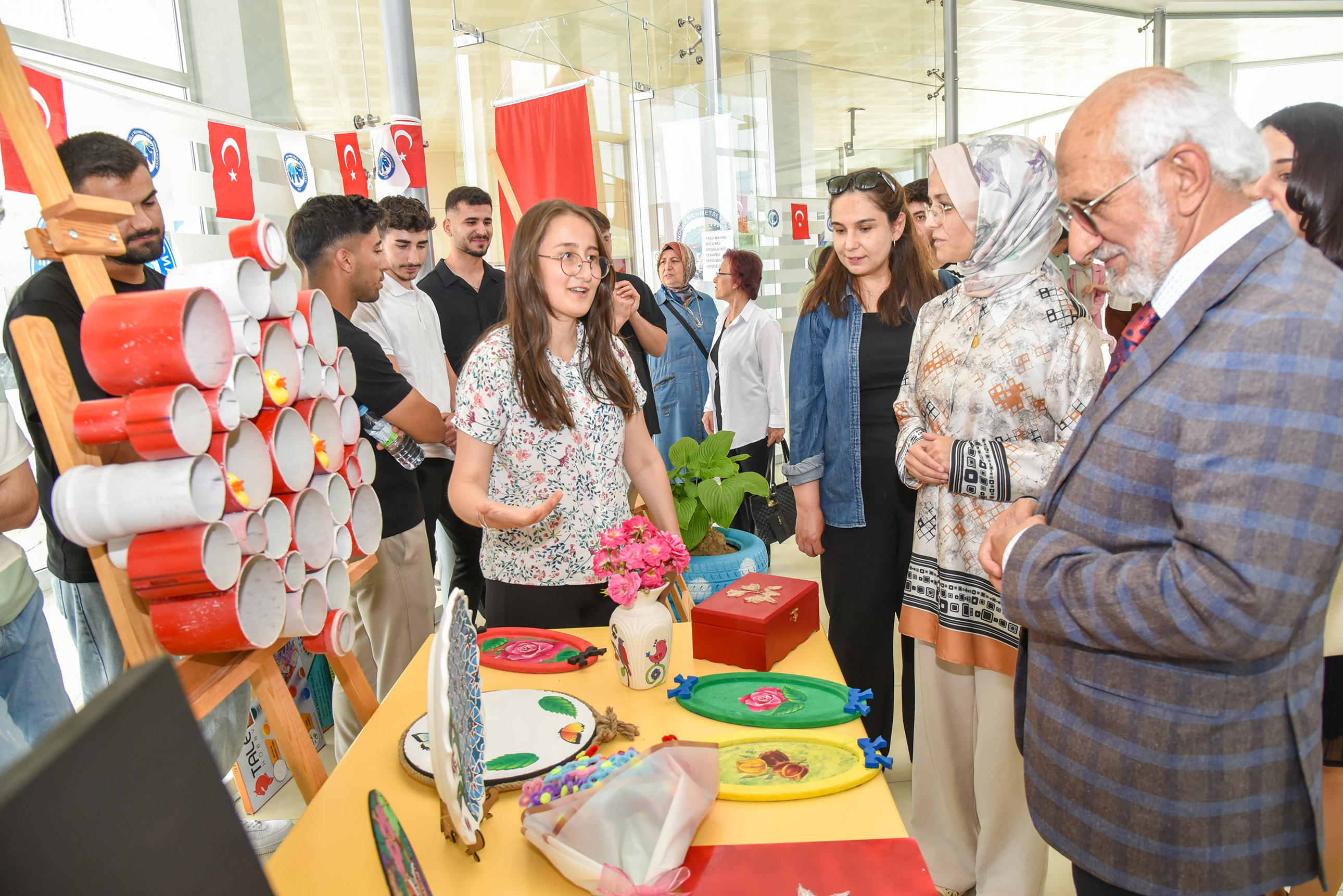 Sağlık Hizmetleri Meslek Yüksekokulu Öğretim Elemanları Öğr. Gör. Dr. Gülsüm Kehribar ile Öğr. Gör. Dr. Mehmet Selçuk’un akademik danışmanlığında öğrenciler; geri dönüşüm, ahşap, hasır, boncuk, yağlı boya, dikiş ve nakış ile engelli ve yaşlıların aktivite yapabileceği pek çok ürün tasarladı.