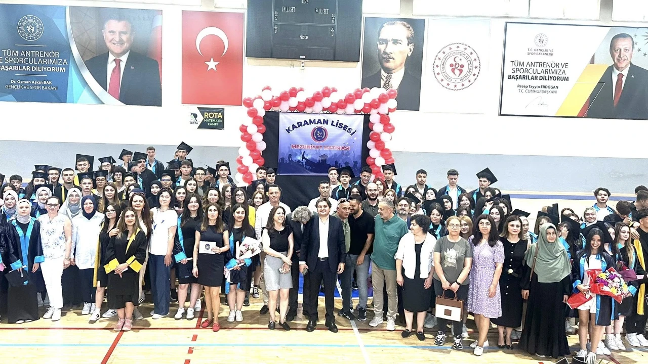 Karaman Lisesi, Kazımkarabekir Spor Salonu'nda coşkulu bir mezuniyet töreni düzenledi. Velilerin yoğun ilgi gösterdiği törende, mezun olan 135 öğrenci kep atma sevinci yaşadı.