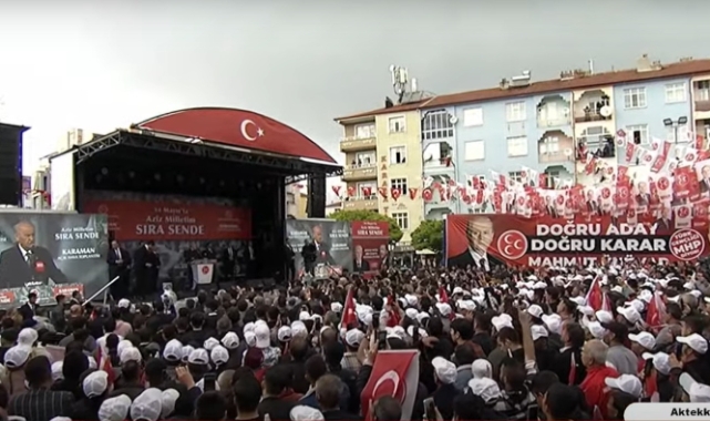 Milliyetçi Hareket Partisi Genel Başkanı Devlet Bahçeli , "14 Mayıs’ta Aziz Milletim Sıra Sende" sloganıyla çıktığı seçim mitinginde Karaman'da konuşuyor.