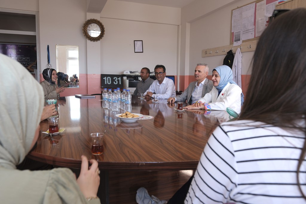 Ziyaretin son bölümünde öğretmenler odasında öğretmenlerle bir araya gelen Vali Mehmet Fatih Çiçekli, eğitim-öğretim süreci hakkında bilgi aldı ve öğretmenlerle görüş alışverişinde bulundu. Öğretmenlik mesleğinin önemine değinen Vali Çiçekli, özverili çalışmaları için tüm öğretmenlere teşekkür etti.
