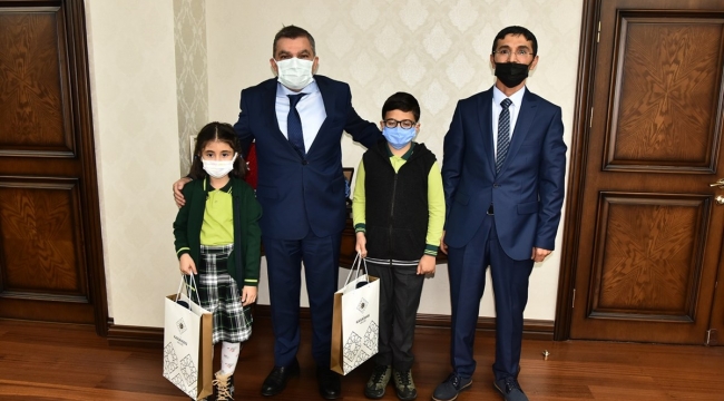 Vali Mehmet Alpaslan Işık, Mehmet Çavaş İlkokulu öğrencileri Tahir Erikoğlu, Ayşegül Kılınç ve okul öğretmeni Mustafa Kaya’yı makamında kabul etti.