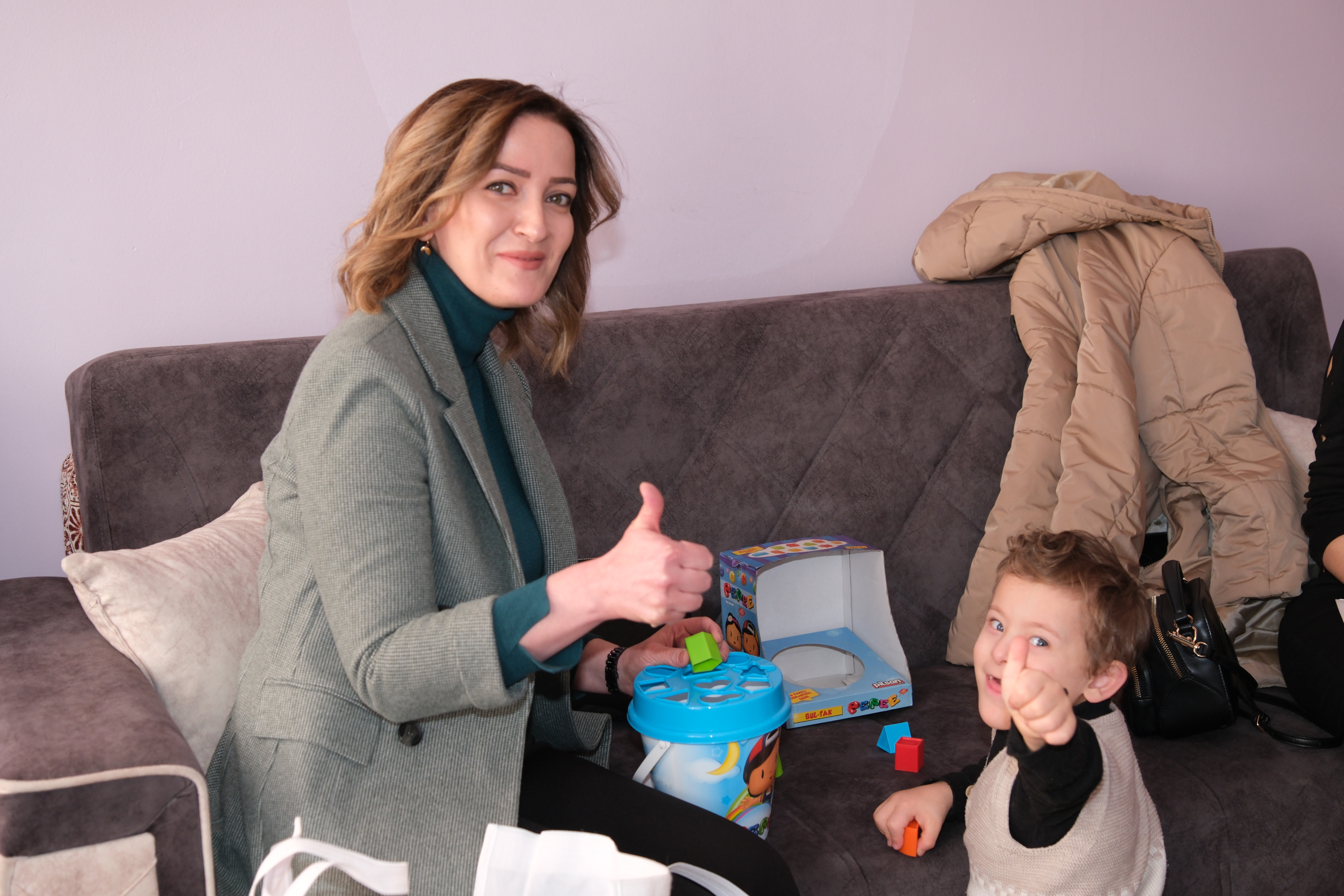 Aile ve Sosyal Hizmetler İl Müdürlüğü Sosyal Çalışmacı Cansu Bayrak Yürekli’nin de eşlik ettiği ziyarette Miraç Sinan’ın annesinden Miraç Sinan’ın sağlık durumu ve gelişimi hakkında bilgi alan Hatice Sarıibrahim Hanımefendi, keyifli vakit geçirdiği küçük Miraç’a çeşitli hediyeler verdi.