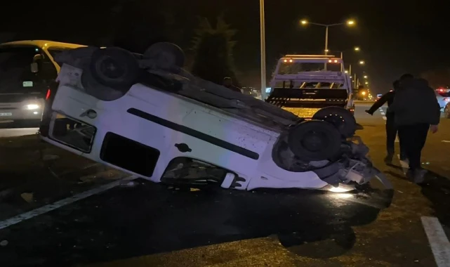 Çarpışmanın etkisiyle savrulan hafif ticari araç refüje vurup devrildi.