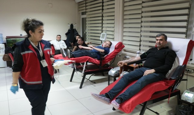 75. Yıl Mühibe Germirli Ortaokulu Müdürü Erol Sarı, öğrencilerin anne babaları ve öğretmenleriyle akın akın kan bağışı için geldiğini söyledi.