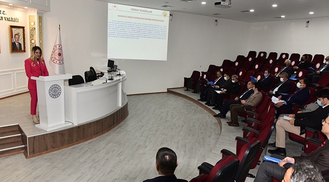 Karaman Orman İşletme Müdürü Ali Özgür Gümüş; araç, ekipman ve personel durumu, orman varlığı ve orman yangınları ile mücadele organizasyonu hakkında katılımcılara bilgiler verirken yangın öncesinde ilgili kurumlar tarafından alınacak önlemleri içeren sunumun ardından toplantı görüş ve önerilerin dile getirilmesiyle sona erdi.