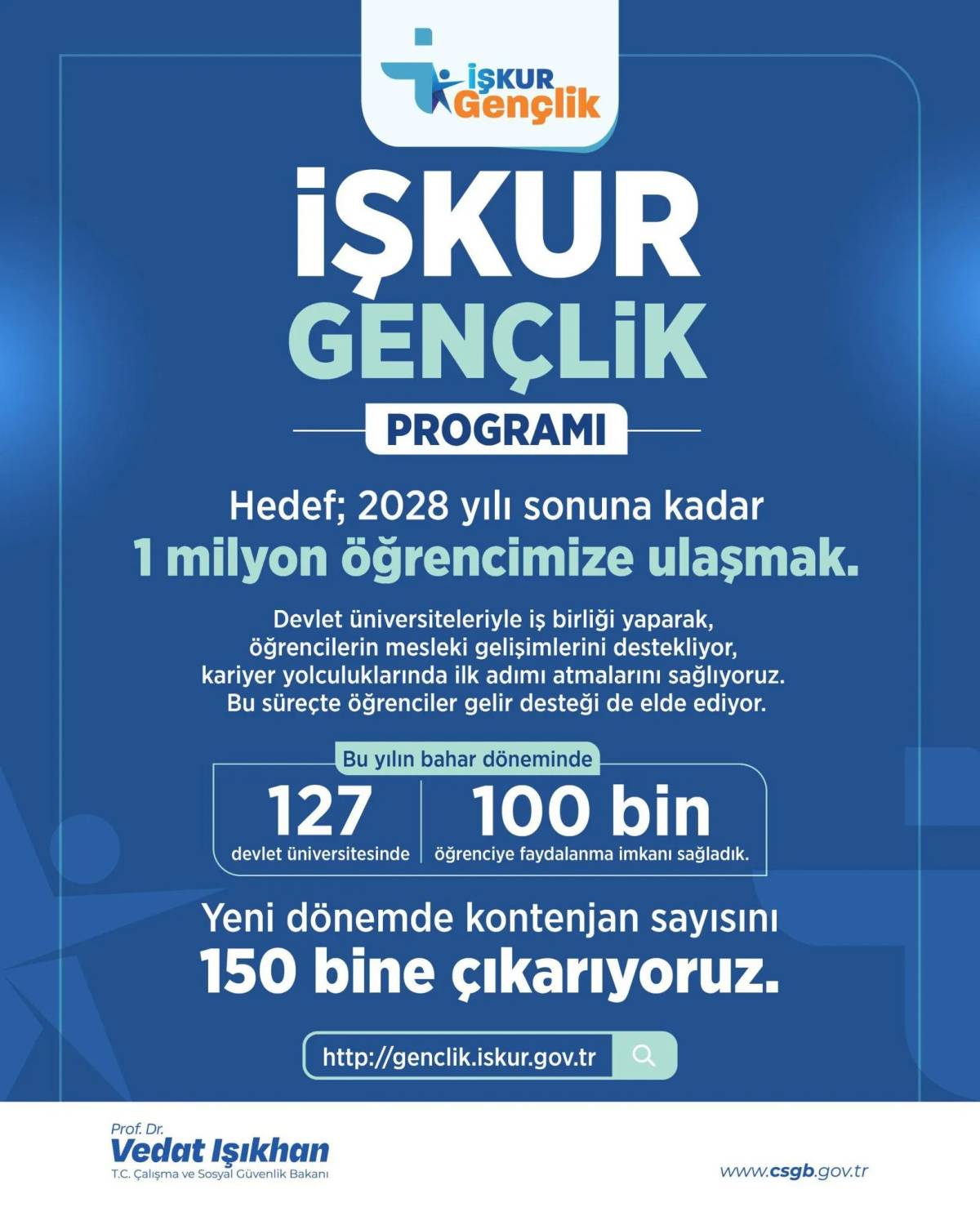 Çalışma ve Sosyal Güvenlik Bakanlığı, 2028 yılı sonuna kadar İŞKUR Gençlik Programı aracılığıyla 1 milyon öğrenciye ulaşmayı hedefliyor. 2025 bahar döneminde 127 devlet üniversitesinde 100 bin öğrenciye ulaşan programın kontenjanı yeni dönemde 150 bine çıkarılacak.