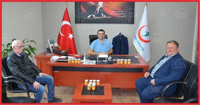 Birlik Başkanı Gürsel Sayan ve merkeze bağlı Taşkale Köyü Muhtarı Hasan Karaca, Devlet Hastanesi Başhekimi Uzm. Dr. Ahmet Yılmaz'ı ziyaret ederek polenleri teslim etti.