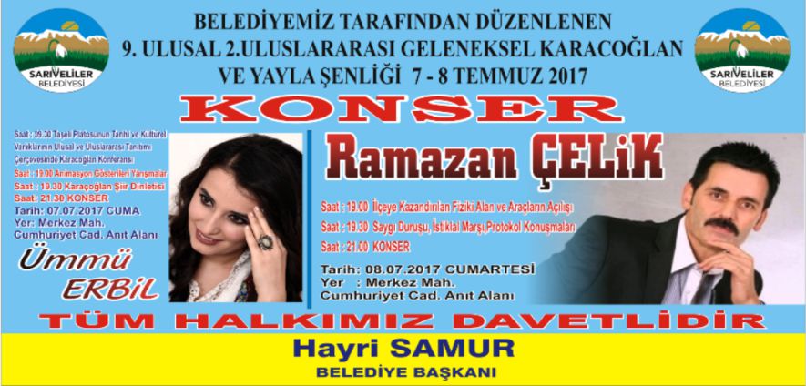 Konu ile ilgili olarak bir açıklama yapan Belediye Başkanı Hayri Samur, ” Belediye olarak eksel hale getirerek kutladığımız Sarıveliler Geleneksel 9. Ulusal 2.Uluslararası Karacoğlan ve Yayla Şenliği’ni bu yıl 7-8 Temmuz 2017 tarihleri olarak belirledik.