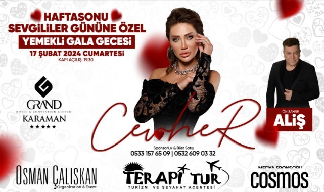 Grand Karaman Otel, 14 Şubat Sevgililer Günü için yemekli gala gecesi düzenleyecek. 17 Şubat Cumartesi akşamı saat 19.30'da Aliş ve Cevher, Grand Karaman'da sahne alacak. Çiftler için romantik ve çok özel bir gecenin yaşanacağı gala gecesinde siz de yerinizi almak istiyorsanız 0533 157 6509 ya da 0532 609 0332 iletişim numaralarıyla irtibata geçerek rezervasyon yaptırabilirsiniz...
