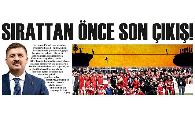 Karaman FK adeta uzatmaları oynamaya başladı. Vali H. Engin Sarıibrahim’in görüşmeleri, güçlü bir yönetim çabaları bir türlü sonuçlanmadı, sonuçlanmıyor. Karaman sanayicileri, şehrin STK’ları söz konusu Karaman olunca sessizliğe bürünüyor, sesi çıkanlar da bin bir bahaneleri masaya koyarak, bu işe gönüllü olmadıklarını, şehrin takımına destek olmamak için ellerinden geleni yaptıklarından hareketle, gururumuz olan bu takımda tehlike çanları çalmayı bırakın, coşmaya başladı.
