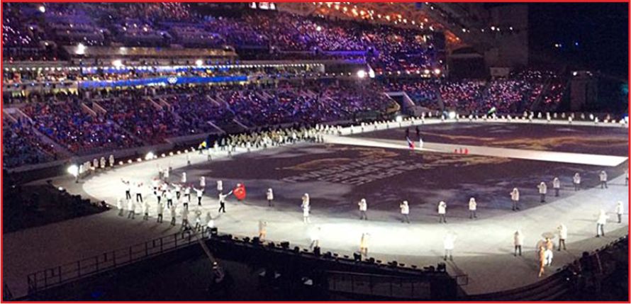 Rusya tarihi ve devrimin anlatıldığı gösteriler sırasında stadyumda yapay kar yağdırıldı. Kış olimpiyatlarında yarışma yapılacak bütün kış sporlarının figürleri, stadyumun tavanındaki raylı sistem sayesinde havada asılı bir şekilde bekletildi.
