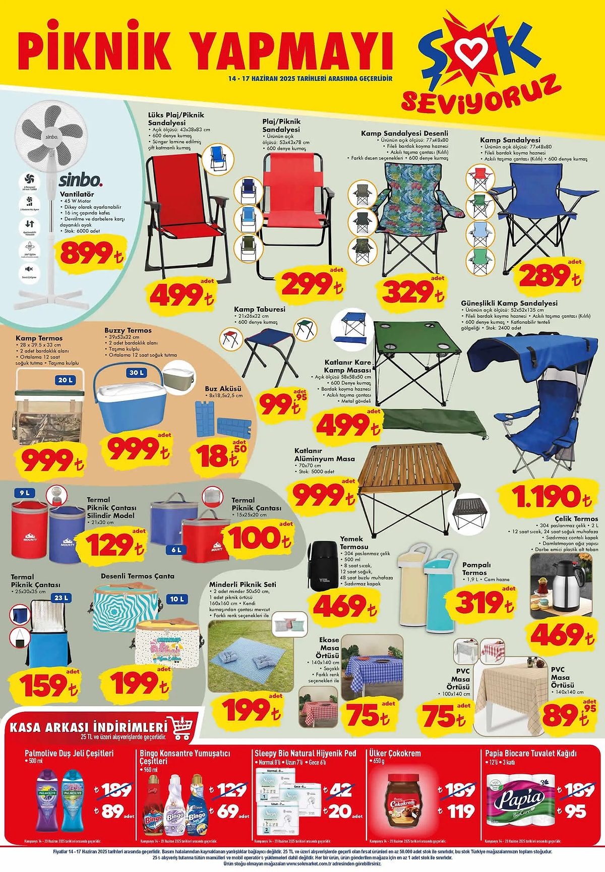 ŞOK, yaz sezonuna özel kamp ve piknik ürünlerinde çok konuşulacak indirimler yapacağını duyurdu. Bu kapsamda, Sinbo vantilatör 899 liradan satışa çıkarken, farklı modellerde plaj ve kamp sandalyeleri 289 lira ile 1.190 lira arasında değişen tutarlarla satılacak.