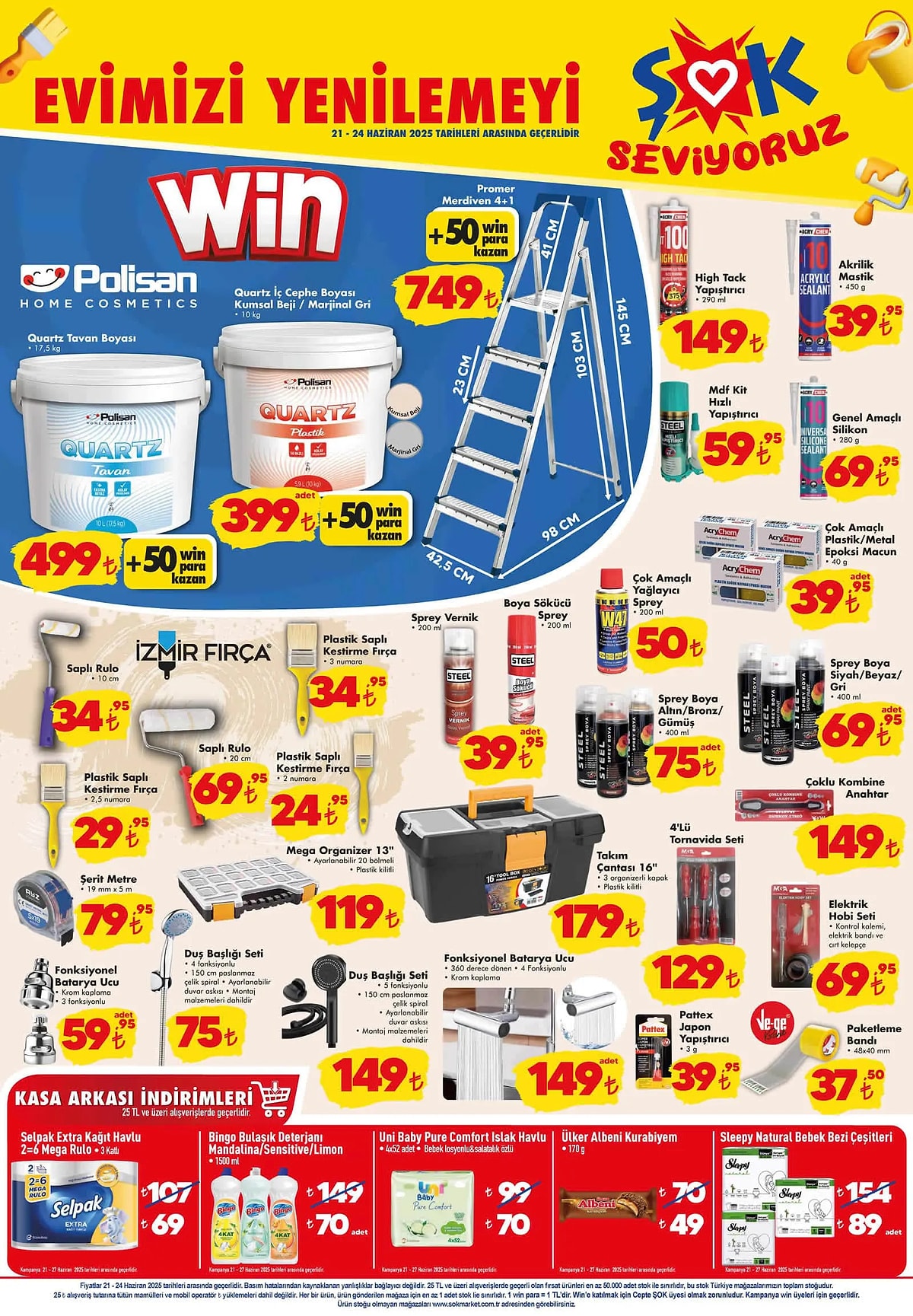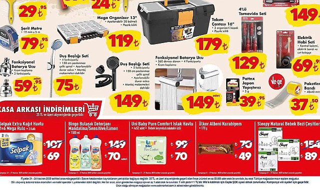 Bunun yanı sıra, farklı ebatlardaki rulolar, kestirme fırçalar ve şerit metre gibi boya yardımcı ürünleri de 21 Haziran’dan itibaren indirimli olarak satılacak. Öte yandan, 25 lira ve üzeri alışverişlerde geçerli indirimli fiyatlar da dikkat çekerken, Selpak Extra kâğıt havlu 69 lira, 1500 ml Bingo bulaşık deterjanı 70 lira, 4’lü Uni Baby ıslak havlu paketi 70 lira ve Ülker Albeni Kurabiyem 49 liradan raflardaki yerini alacak.