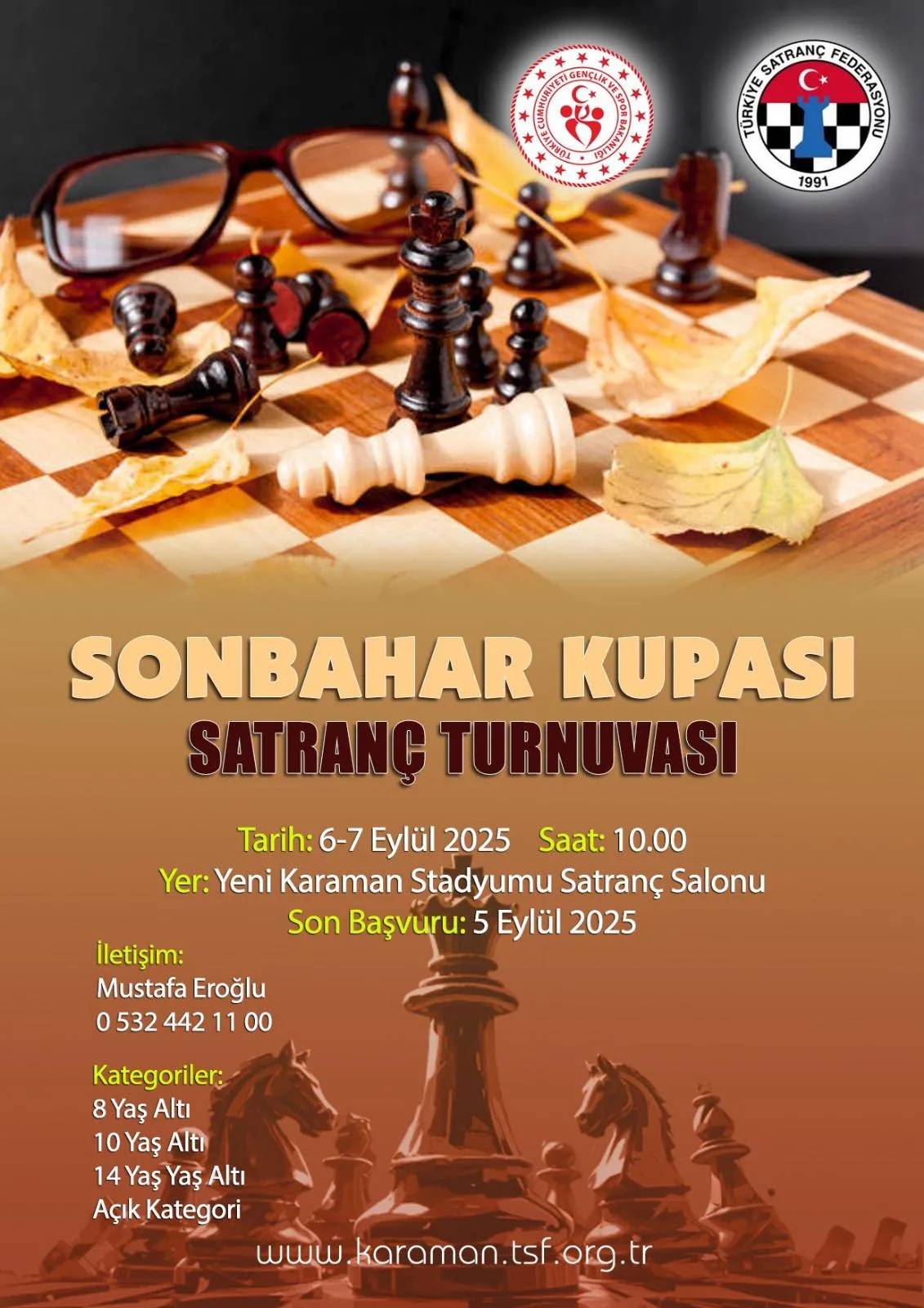 Karaman Satranç İl Temsilciliği, 6-7 Eylül tarihlerinde “Sonbahar Kupası Satranç Turnuvası”nı düzenleyecek. Turnuva, Yeni Karaman Stadyumu Satranç Salonunda gerçekleştirilecek. Katılım için son tarih 5 Eylül Cuma günü olarak belirlendi.