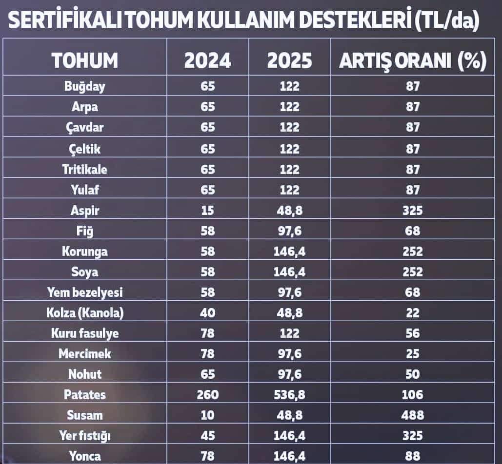 Sertifikalı tohumluk desteğinde ise mahsul ile sertifikalı tohumluk arasındaki farkı en aza indirecek bir destek rakamı belirlenmiştir.