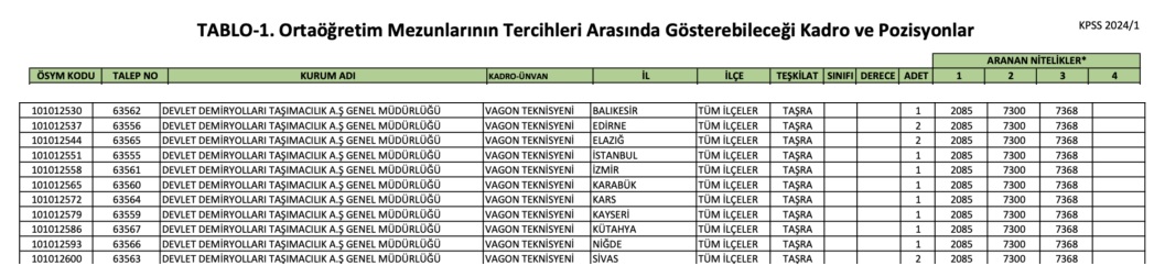 KPSS 2024/1 tercihleri ileT.C Devlet Demiryolları İşletmesi Genel Müdürlüğü ve Devlet Demiryolları Taşımacılık A.Ş. ortaöğretim, ön lisans ve lisans mezunlarından memur alımı yapılacak. Tercih yapacak adayların belirtilen şartları, nitelik kodları ve özel koşulları dikkatle incelemesi gerekmektedir.