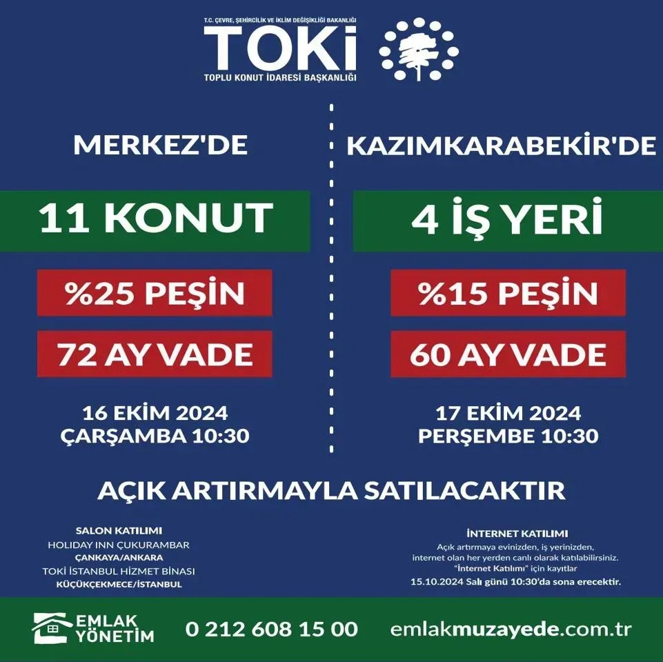 Açık artırma, 16 Ekim 2024 Çarşamba günü saat 10:30'da Karaman Merkez’deki konutlar için; 17 Ekim 2024 Perşembe günü yine saat 10:30’da Kazımkarabekir’deki iş yerleri için yapılacak. Fiziki katılım Holiday Inn Çukurambar Çankaya/Ankara ve TOKİ İstanbul Küçükçekmece Hizmet Binası’nda gerçekleştirilecek. Ayrıca, vatandaşlar internet üzerinden de canlı olarak açık artırmaya katılabilecek.