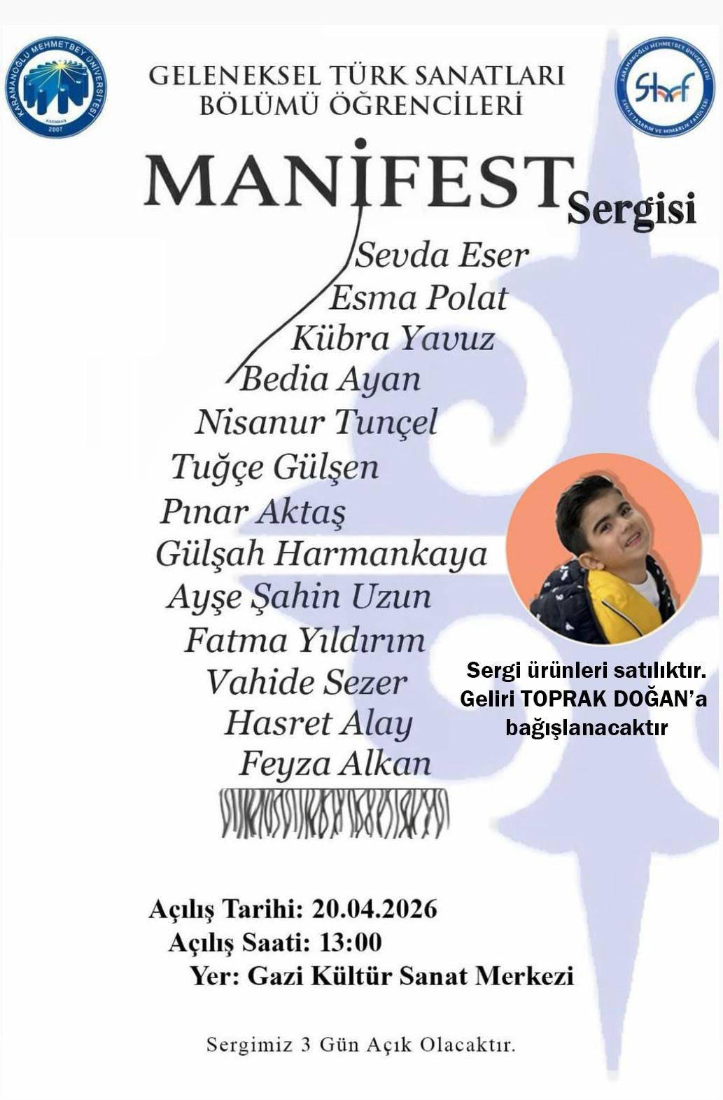 Karaman’da Karamanoğlu Mehmetbey Üniversitesi Geleneksel Türk Sanatları Bölümü öğrencileri tarafından hazırlanan “MANİFEST” adlı sergi, sanatseverlerle buluşuyor. Sergiden elde edilecek gelir, DMD Kas Hastası Toprak Doğan’a bağışlanacak.