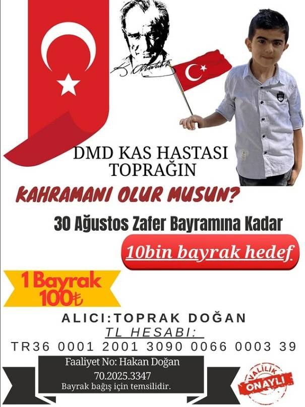 Karaman’da 8 yaşındaki Toprak Doğan, nadir görülen bir kas hastalığı olan Duchenne Musküler Distrofi (DMD) nedeniyle zor bir tedavi sürecine girdi. Babası Karaman’da mobilyacılık yapan Toprak, Dubai’de yapılacak tedavi için yaklaşık 3 milyon dolar masrafa ihtiyaç duyuyor.