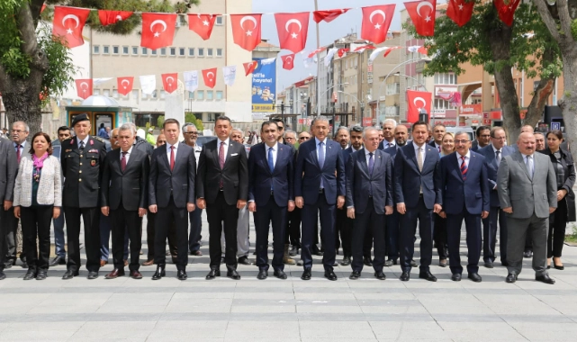 Törende Karaman Valisi Tuncay Akkoyun, Belediye Başkanı Savaş Kalaycı ve KMÜ Rektörü Prof. Dr. Mehmet Gavgalı Atatürk Anıtına çelenk sundu.