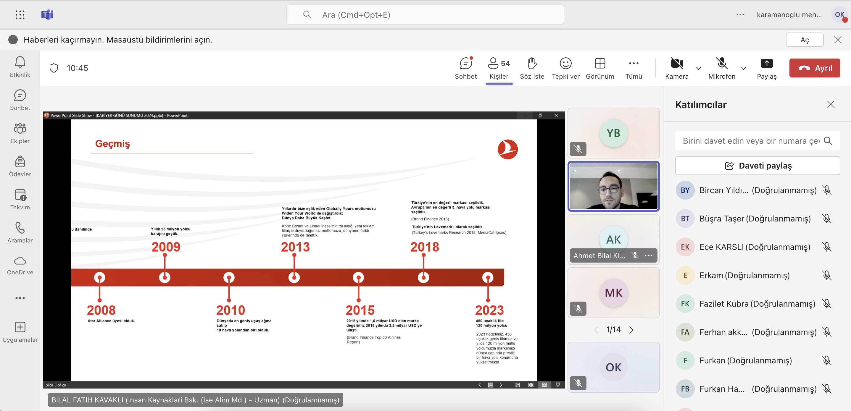 Konferansta ilk olarak Türk Hava Yolları (THY) Uzman Bilal Fatih Kavaklı tarafından Türk Hava Yollarının kariyer olanakları anlatıldı. THY İnsan Kaynakları Uzmanı İlker Oler tarafından gerçekleştirilen sunumun ardından ise katılımcıların merak ettiği sorular yanıtlandı.
