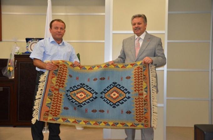 Daha sonra Belediye Başkanı Murat Orhan, Vali Süleyman Kahraman'a Mut'ta dokunan bir kilim hediye etti.