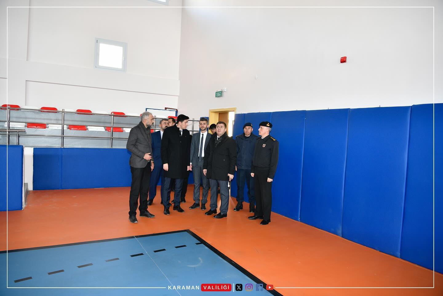 Vali H.Engin Sarıibrahim, Ermenek’te yapımı tamamlanan kapalı spor salonunda incelemelerde bulunarak, Ermenek Kaymakamı Fatih Erdoğan’dan bilgiler aldı.