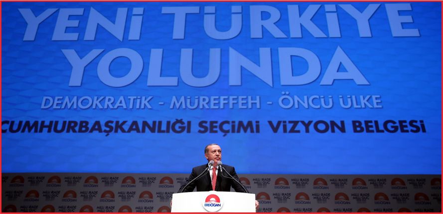 Cumhurbaşkanı adayı ve Başbakan Recep Tayyip Erdoğan, Haliç Kongre Merkezinde Cumhurbaşkanlığı Türkiye Vizyon Belgesi'ni açıkladı. 12 yıllık AK Parti iktidarında yapılanları özetleyen Erdoğan, konuşmasında sık sık "Yeni Türkiye" vurgusu yaptı. "Eski Türkiye artık eskide kalmıştır. Eski Türkiye’nin kapıları kapanmıştır" diyen Erdoğan, muhalefetin adayı Ekmeleddin İhsanoğlu'nun "Cumhurbaşkanlığı icra makamı değil" değerlendirmesine yanıt verdi. Erdoğan, "Bu yarışta le beraber değerli iki partinin adayı ne diyor ‘icranın başı değildir’. Tavsiye ederim anayasayı okusun. 104. Maddede var. Devletin başı cumhurbaşkanıdır, icranın başıdır" diye .