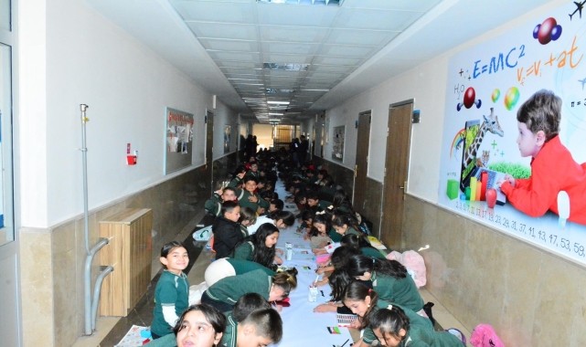 Agahefendi İlkokulu'nda eğitim gören 200 öğrenci, İsrail katliamı altında yaşam sürdüren Filistinli çocuklara destek olup gönül birliği sağlamak için 30 metrelik resim kağıdına katliamı protesto eden resimler yaptı.